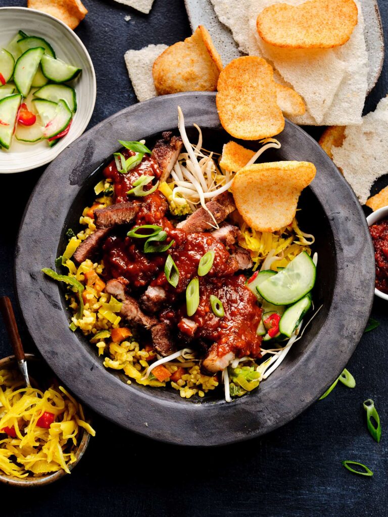 3. I serve it with noodles, atjar, bean sprouts, pickled cucumber and lots of prawn crackers.