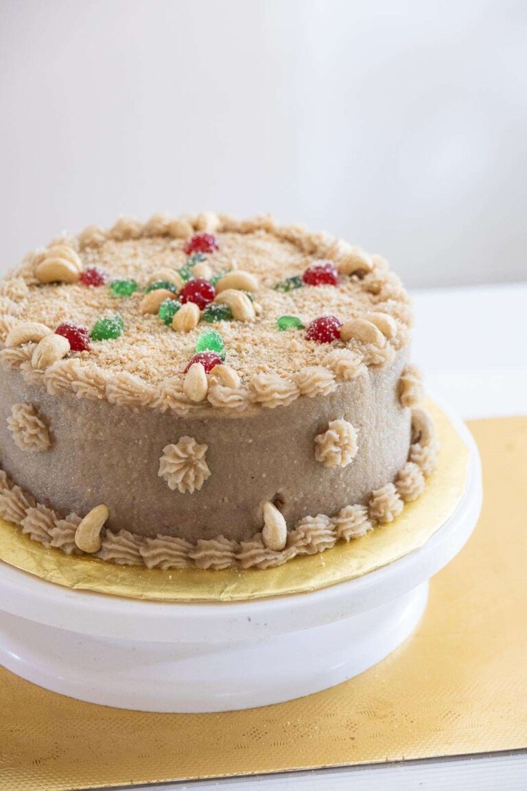 - Once the cake is filled, spread the cashew nut paste all over the outside of the cake. Do not allow the cashew filling to cool as it will set and you will have to reheat it.