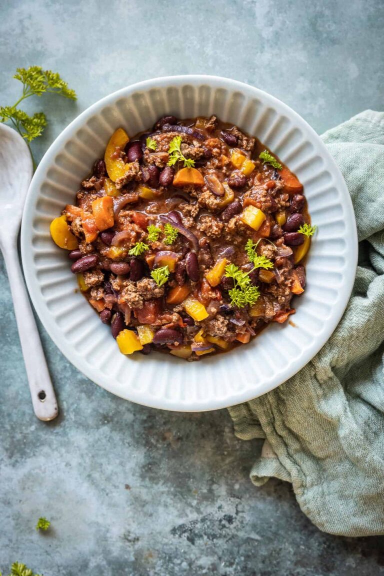 There are about as many variations to chili con carne as you can possibly imagine. People throw in all sorts of ingredients so it’s easy to make different versions of this classic. You can make it into an easy chili sin carne by taking the beef out and replacing it with more beans or vegetarian ground beef (not sure how that is called where you live though, but I guess you know what I mean).