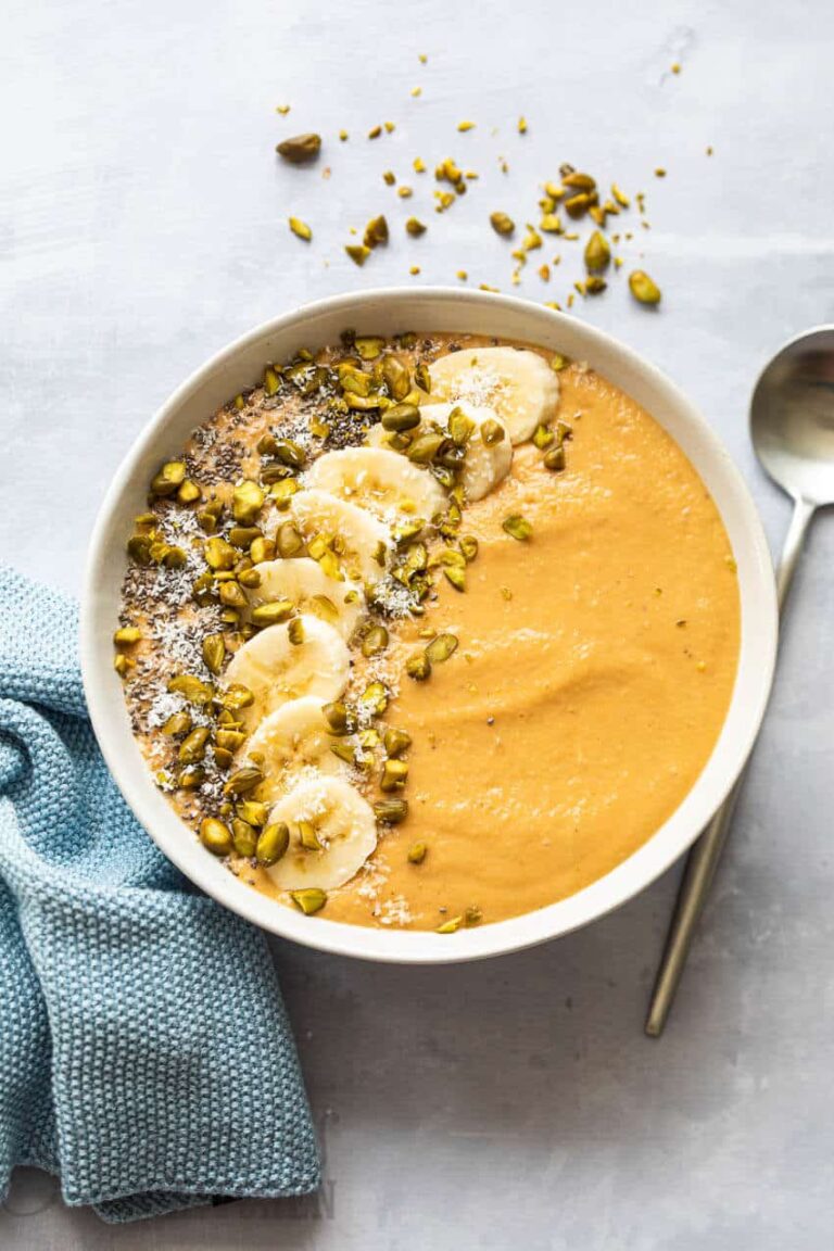 Now this smoothie bowl recipe is super easy to vary. It’s a healthy smoothie and with a smoothie base of sweet potato you can add various different additions to this that will work really well. Instead of the coconut yogurt you can add coconut milk, cashew milk or almond milk. Both will work great. The milks will have a thinner consistency than the yogurt. I also love adding a spoonful of either peanut butter (not paleo) or almond butter (paleo). You can make it more into a fruit smoothie by adding various fruits. Mango, berries of any kind. They will all work well. Perfect for upping your vitamin C intake as well. Or for extra dietary fiber half an avocado is also perfect. Keep in minder that avocado (and blue berries) immediately thicken the end result of your sweet potato bowls.