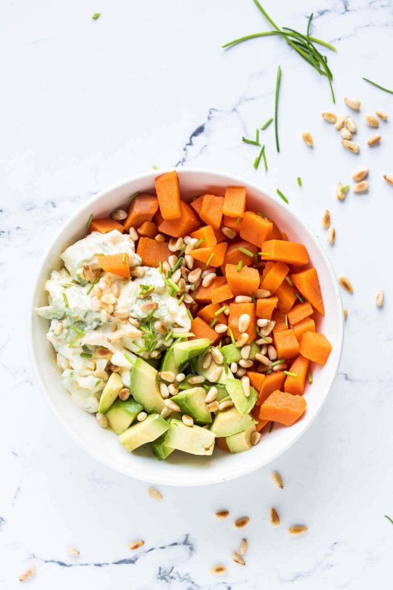 - Make your bowl by adding the sweet potato, the egg salad and the avocado cubes. Sprinkle the roasted pinenuts and some extra chives on top.