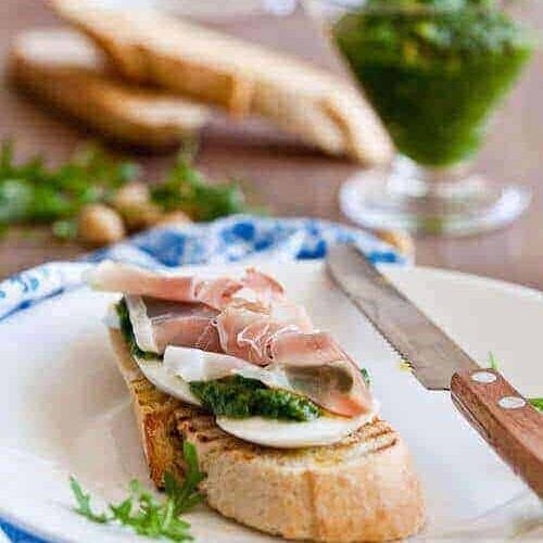 Put some of the slices of mozarella on the toast and liberally cover with the pesto. Top this with a slice of prosciutto and finish with some salt and pepper.