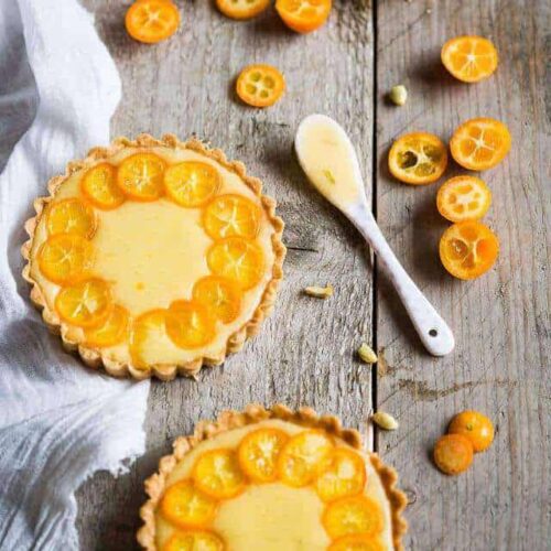 Pour the lime curd into the baked shells and reduce the heat in the oven to 150 C (300 Fahrenheit). Slice the kumquats as thin as you can and arrange them nicely on the tarts in whatever shape you want and bake them for about 10 minutes or until the curd is set. Remove from the oven and let cool completely before slicing.