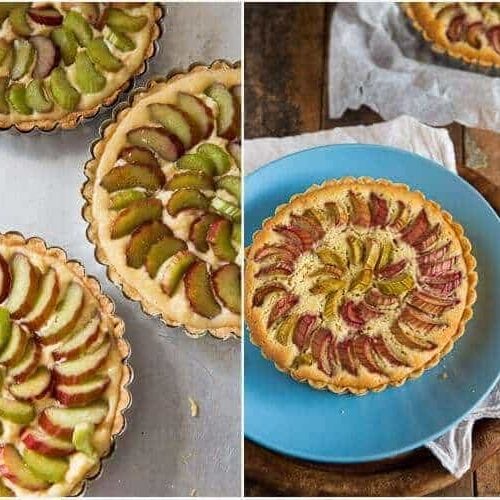 Cut the rhubarb into small slices and put them in a bowl together with the cinnamon and the sugar. Toss until it is coated or alternatively you can sprinkle it on top before putting it in the oven. Press the pieces of rhubarb into the frangipane
