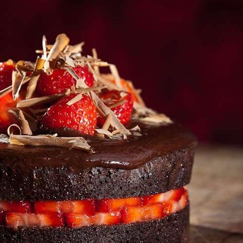 Layer the cakes with the strawberries in the middle and divide the ganache over the top of the cake.
